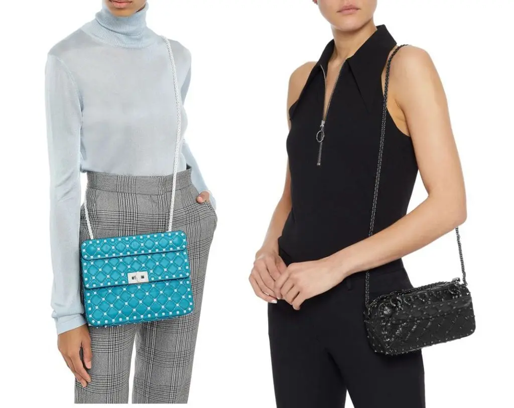 VALENTINO GARAVANI Rockstud Spike small quilted cracked-leather shoulder bag黑色鉚釘包折上折