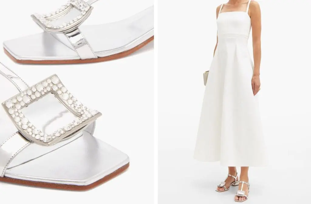 ROGER VIVIER Vicky Viv crystal-buckle metallic-leather sandals 銀色方框水鑽涼鞋也太美7折