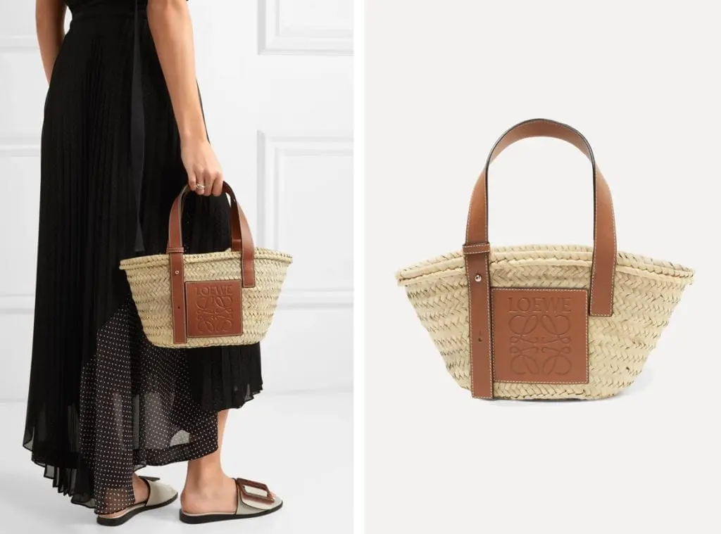 LOEWE Small leather-trimmed woven raffia tote Loewe小款藤編包退稅好價