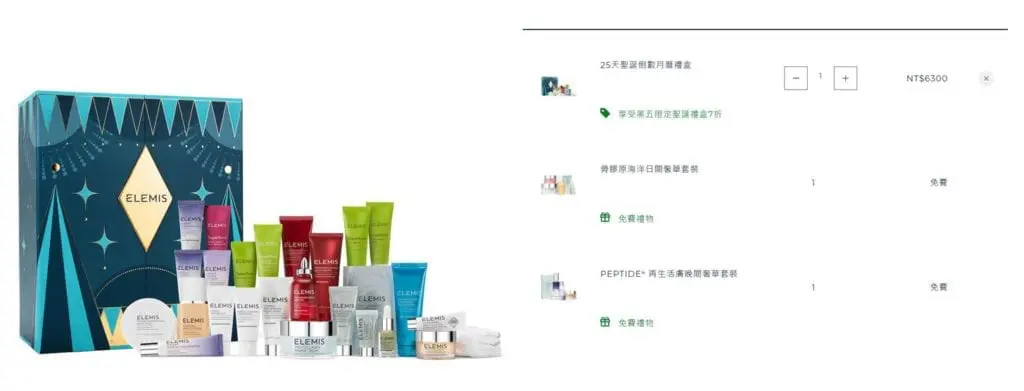 太超值買一組送兩組!! Elemis 25天聖誕倒數月曆禮盒(剛試加購物車自動打7折),這組加進購物車送了(1)Peptide再生活膚晚間套裝(價值$3600)+ (2)骨膠原海洋日間奢華套裝(價值$3920)實在太超值了