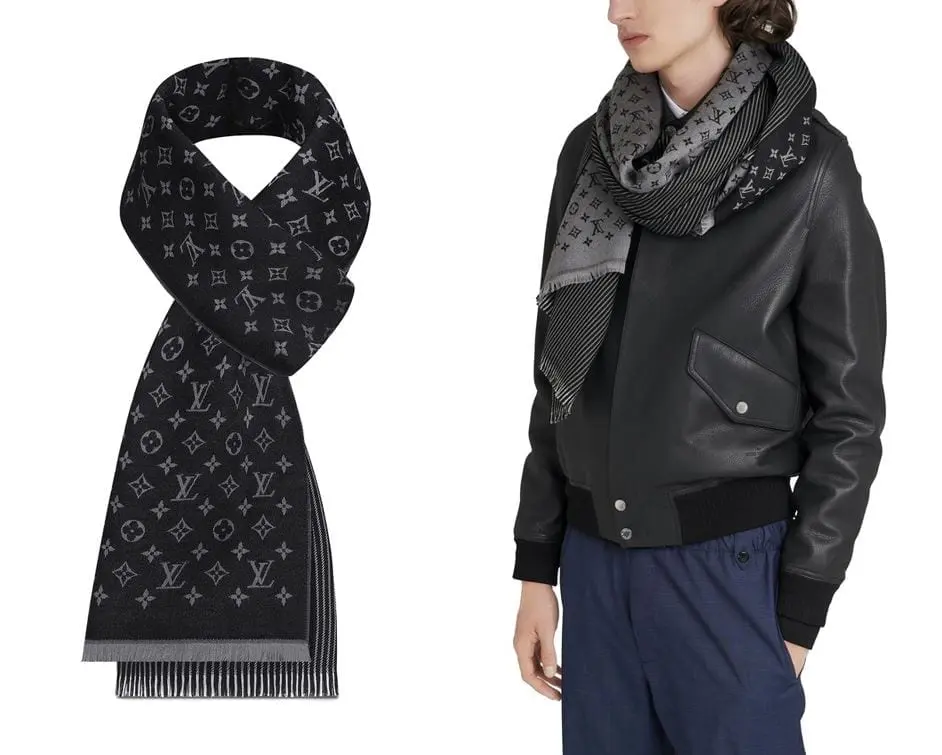 LOUIS VUITTON Monogram Lines Stole 黑色Logo羊毛混絲綢圍巾男女都可用