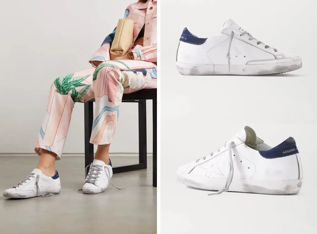 這雙超便宜GOLDEN GOOSE Superstar distressed leather and suede sneakers 白色藍尾巴小髒鞋 寄台灣$341.8約台幣NT$9,741
