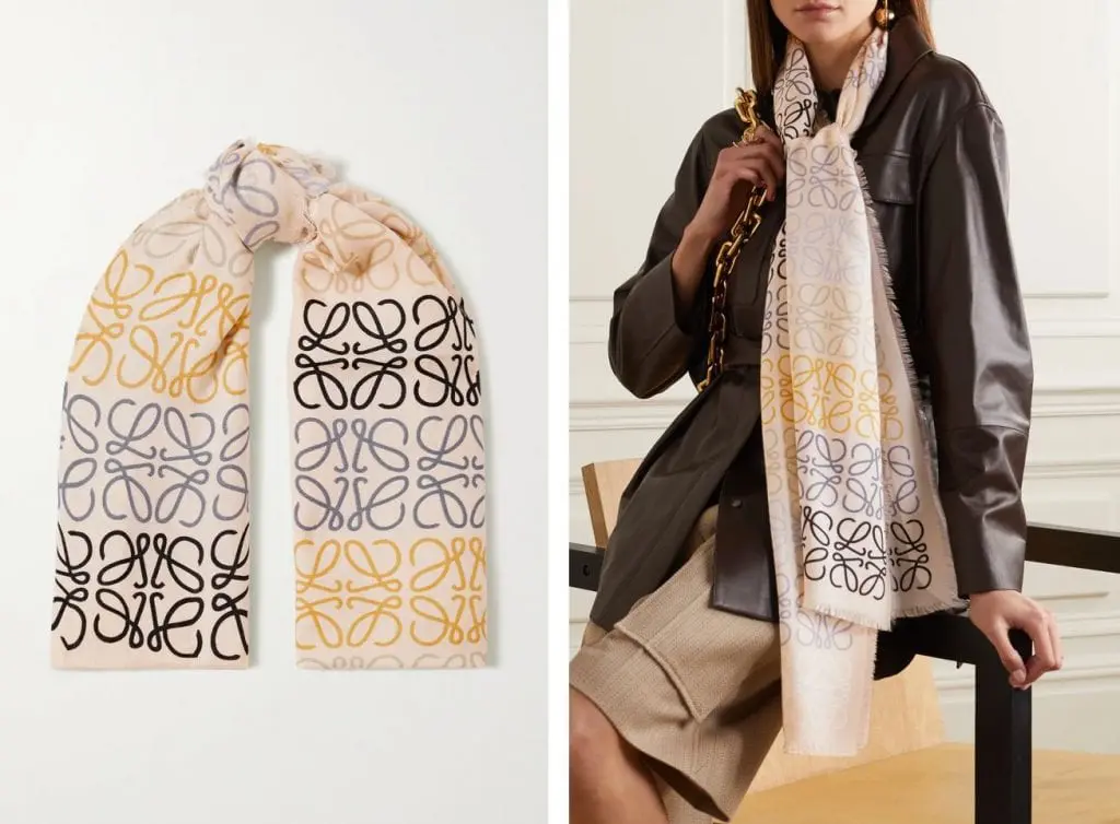 69折快!! LOEWE Fringed printed wool, silk and cashmere-blend scarf 薄款Logo圍巾