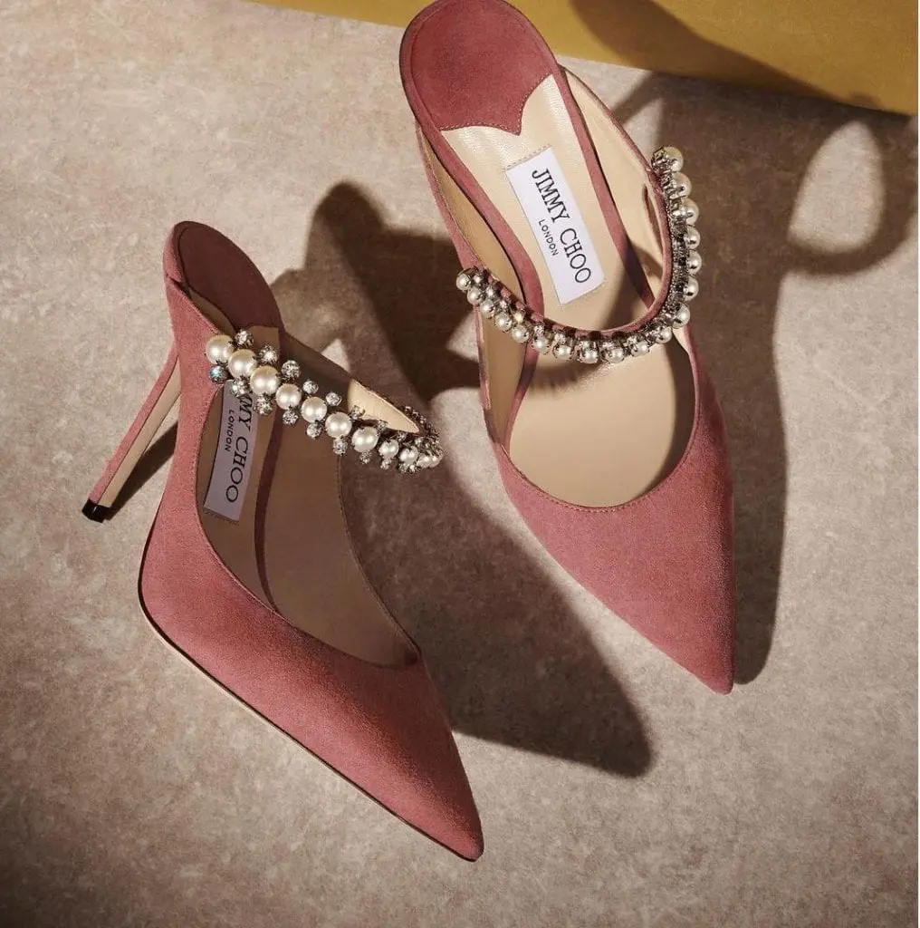 JIMMY CHOO Bing 100 crystal-embellished patent-leather heeled mules 粉色珍珠水鑽穆勒跟鞋超美